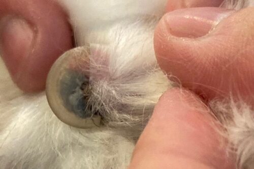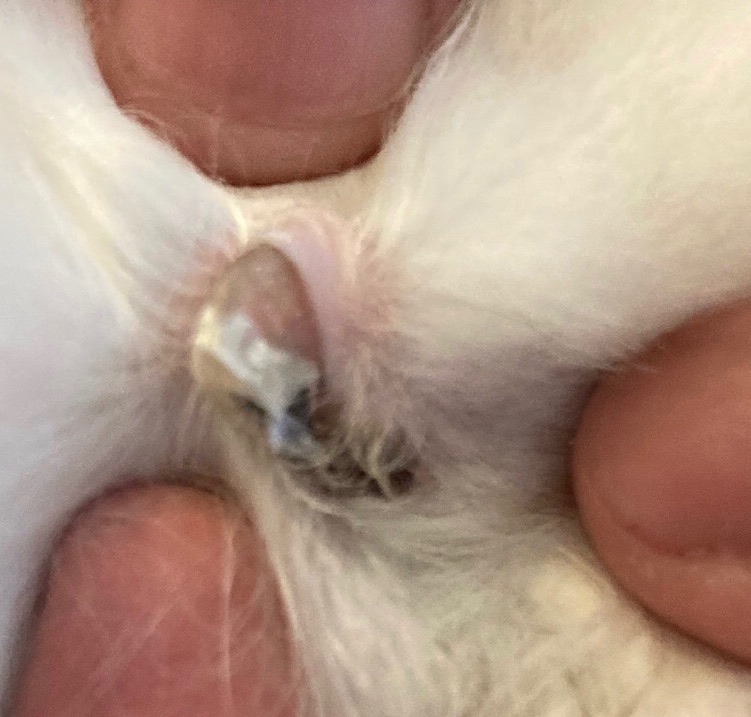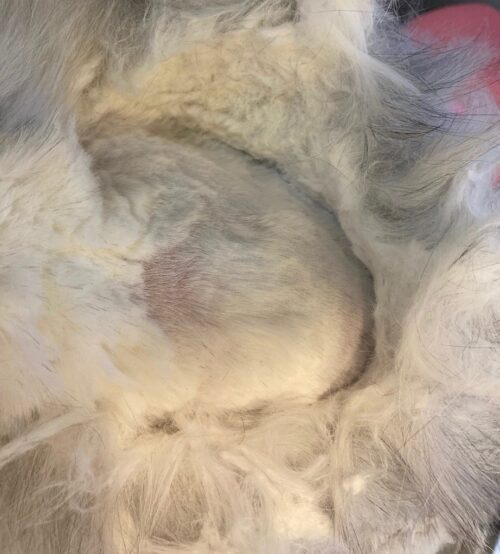 毛玉の中はこんな感じです。フェルト化して、一部かぶれて皮膚炎を起こしていました。