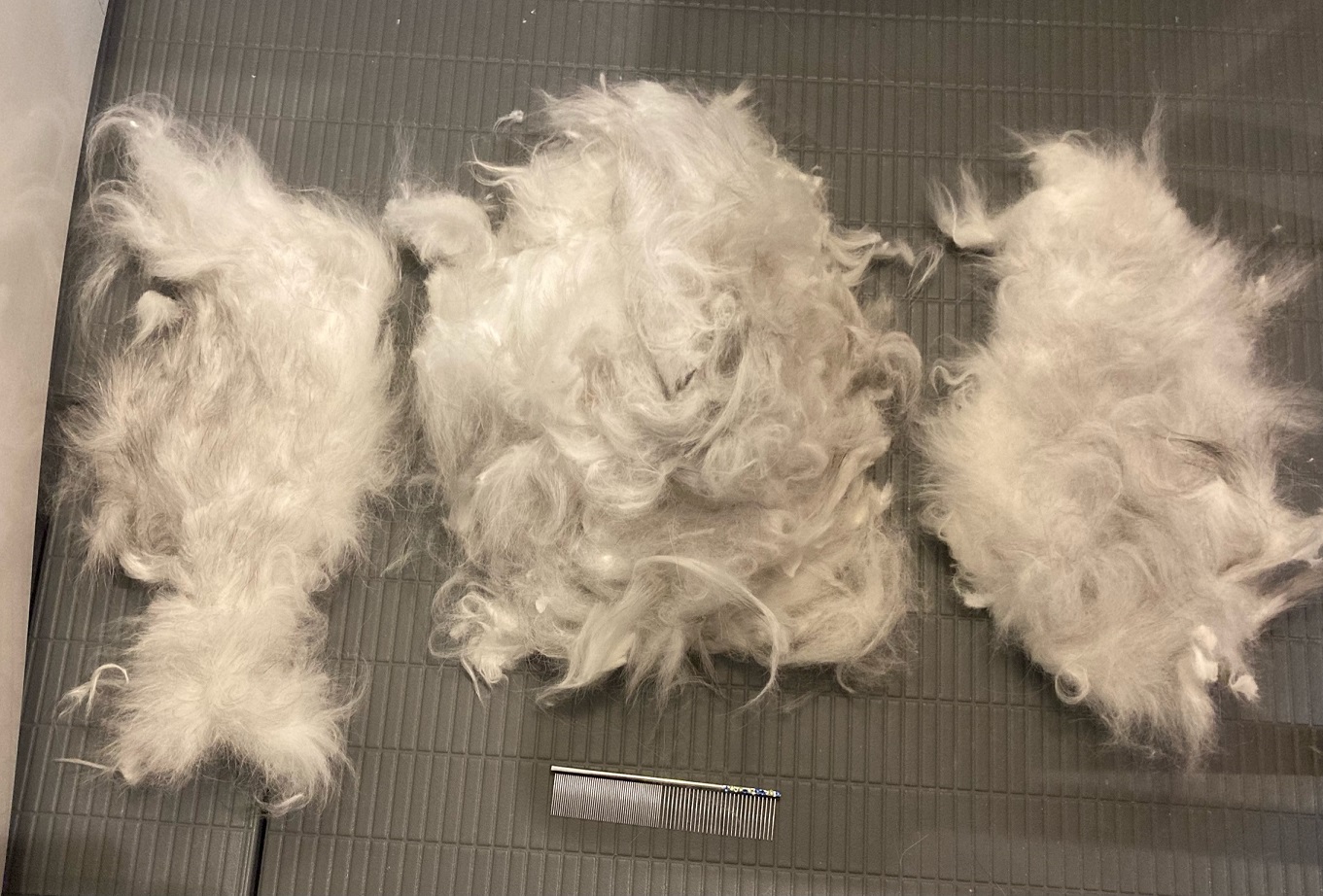 左が右脇からお腹 真ん中の大きいのが背中 右にあるのが左脇からお腹にあった毛玉です。