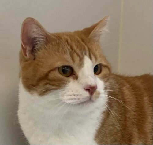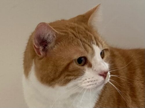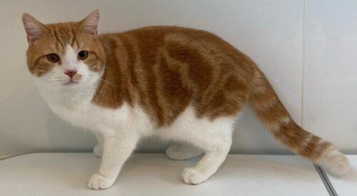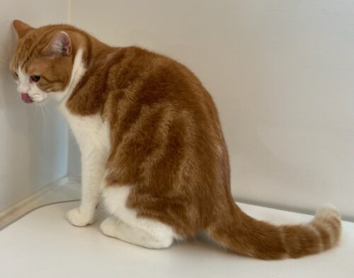 レッドタビーのバイカラーマスク(八割れ)が綺麗で鼻の所の柄がお茶目ですね。