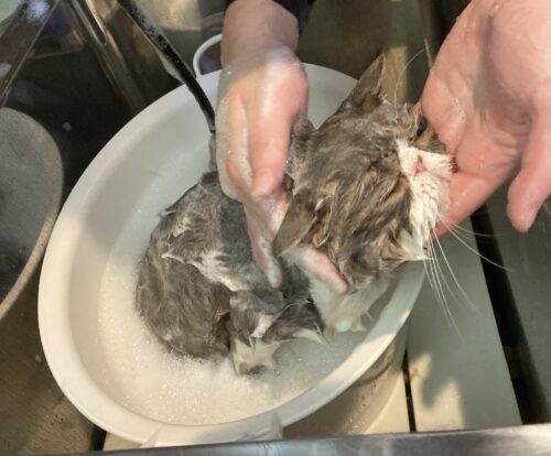 猫は濡れるととても小さくなります。たまに例外の子も居ますけど。